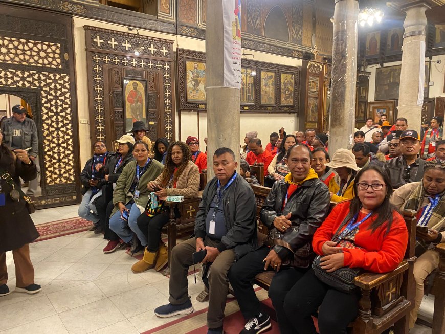 KAIRO - Setelah mengunjungi Piramida Giza, rombongan peziarah melanjutkan perjalanan rohani dengan mengunjungi sejumlah situs bersejarah di Kairo, Mesir, di antaranya Gereja Keluarga Kudus, Sinagoge di Distrik Koptik, dan Gereja Gantung.
