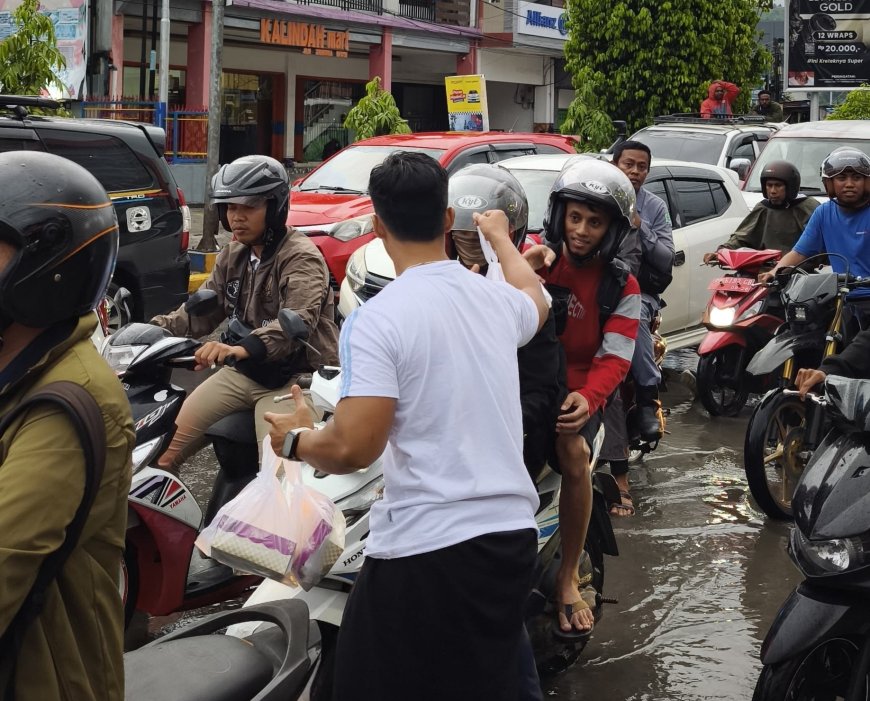 MANOKWARI - Keluarga Besar Lamongan Manokwari membagikan takjil gratis kepada para pengendara yang melintas di perempatan H. Bauw, Wosi, Jumat (13/3/2026). Kegiatan sosial ini dilakukan sebagai bentuk kepedulian kepada masyarakat yang sedang menjalankan ibadah puasa di bulan Ramadan.
